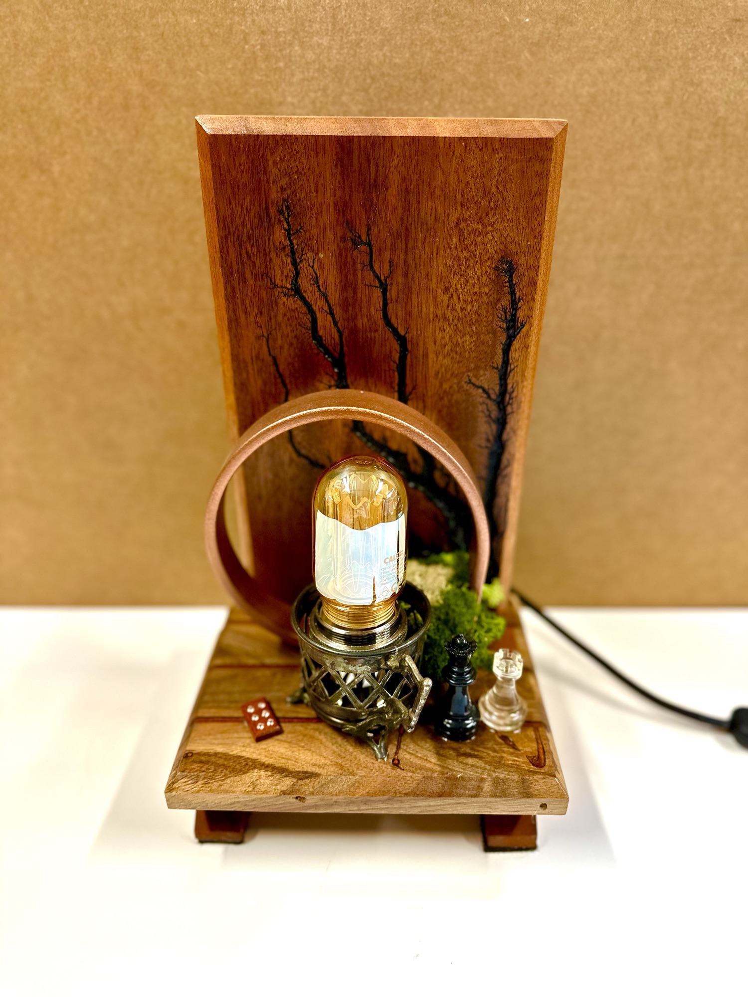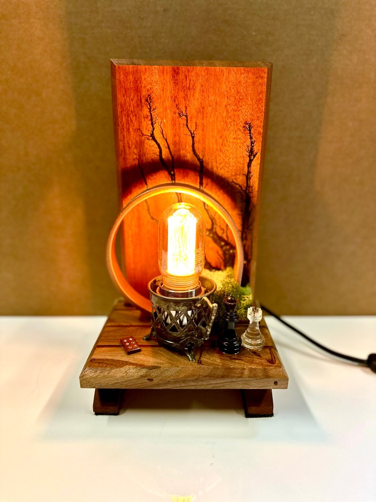 L’anneau en acier qui entoure l’ampoule Edison émet une lumière chaleureuse, peint pour compléter le bois et la lumière, ajoutant une touche industrielle. À côté, une tasse de thé miniature et des éléments de jeu, tels que des pions d’échecs et des dés, invitent à la contemplation et au loisir, symbolisant les moments de détente que l’on savoure sous l’éclat d’une lumière apaisante.