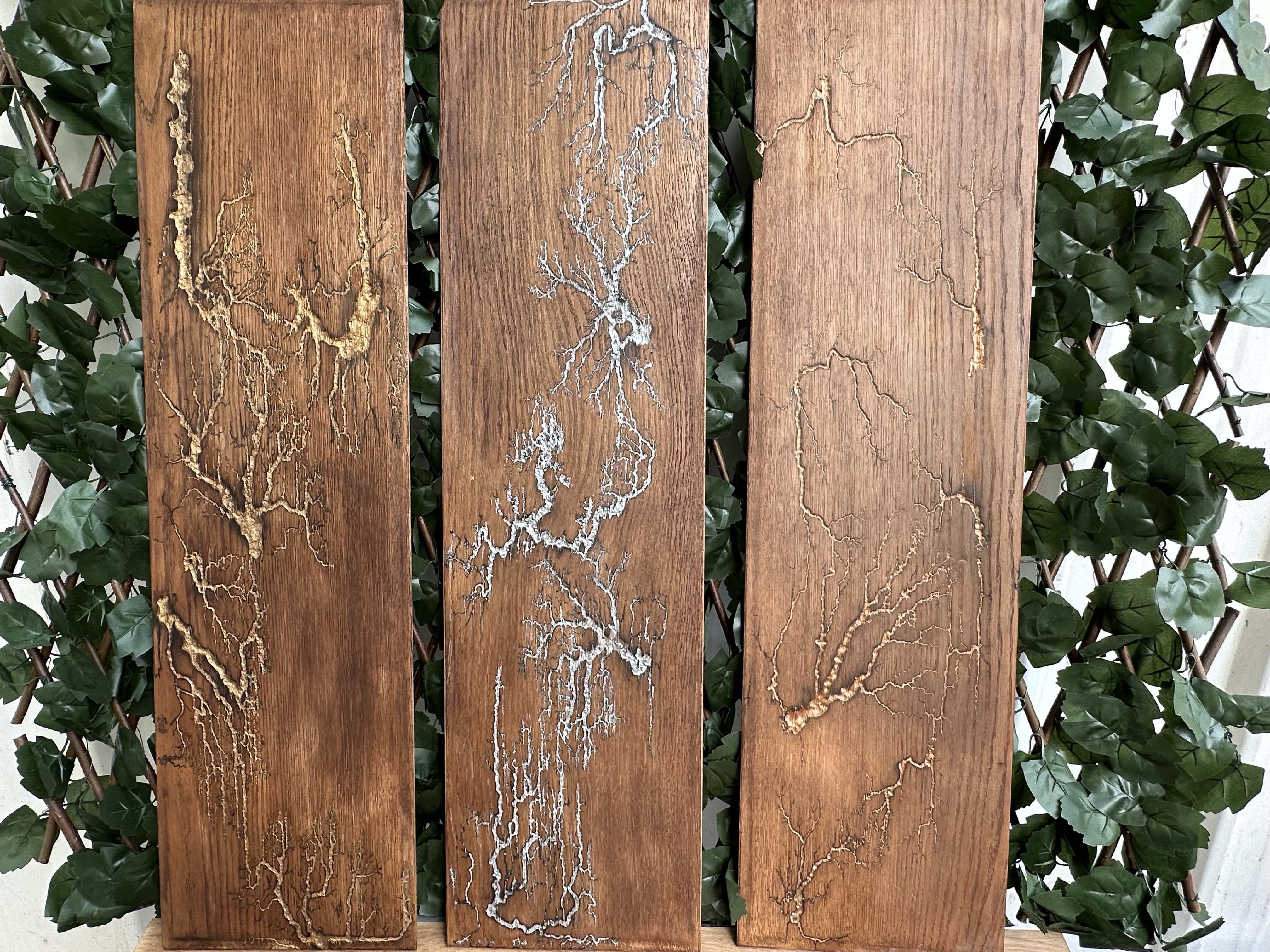 Intitulé « Eclats d’Énergie », ce triptyque en bois saisit la beauté brutale et éphémère des éclairs capturés à travers le procédé des figures de Lichtenberg. Les sillons électrisés sont méticuleusement comblés avec des pigments dorés, argentés et cuivrés, conférant à chaque panneau une élégance céleste unique.