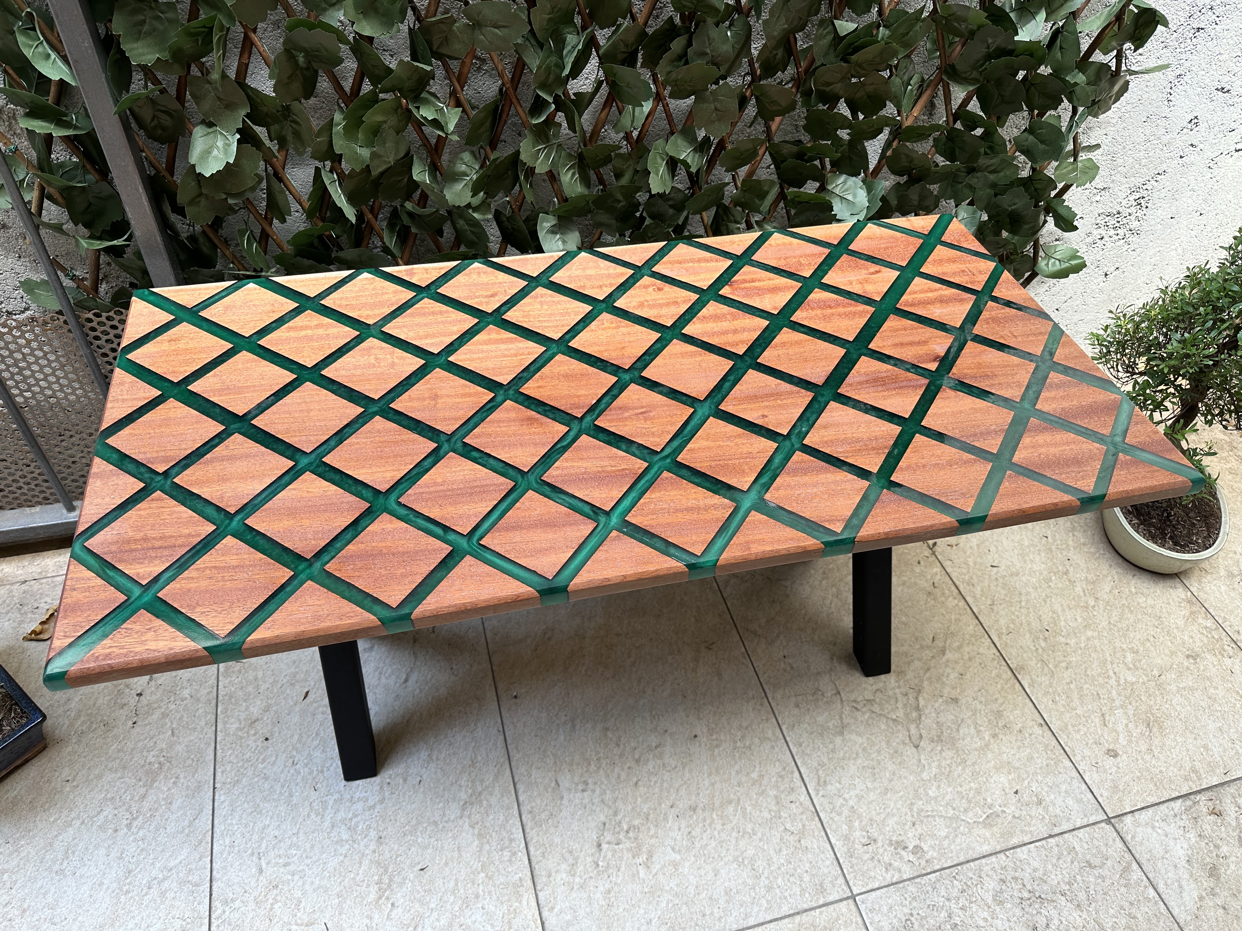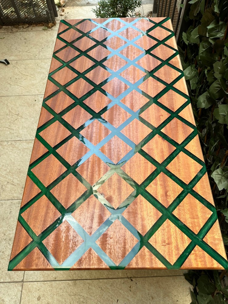 La « Rio Verde » est une pièce maîtresse qui capture l’essence de la simplicité élégante. Conçue avec du bois de Sipo soigneusement sélectionné, chaque table raconte une histoire unique grâce à ses veines distinctives et son grain naturel. Au centre, une rivière de résine époxy d’un vert métallique profond serpente, rappelant les eaux tranquilles d’un ruisseau forestier, ajoutant un contraste saisissant et un attrait visuel.