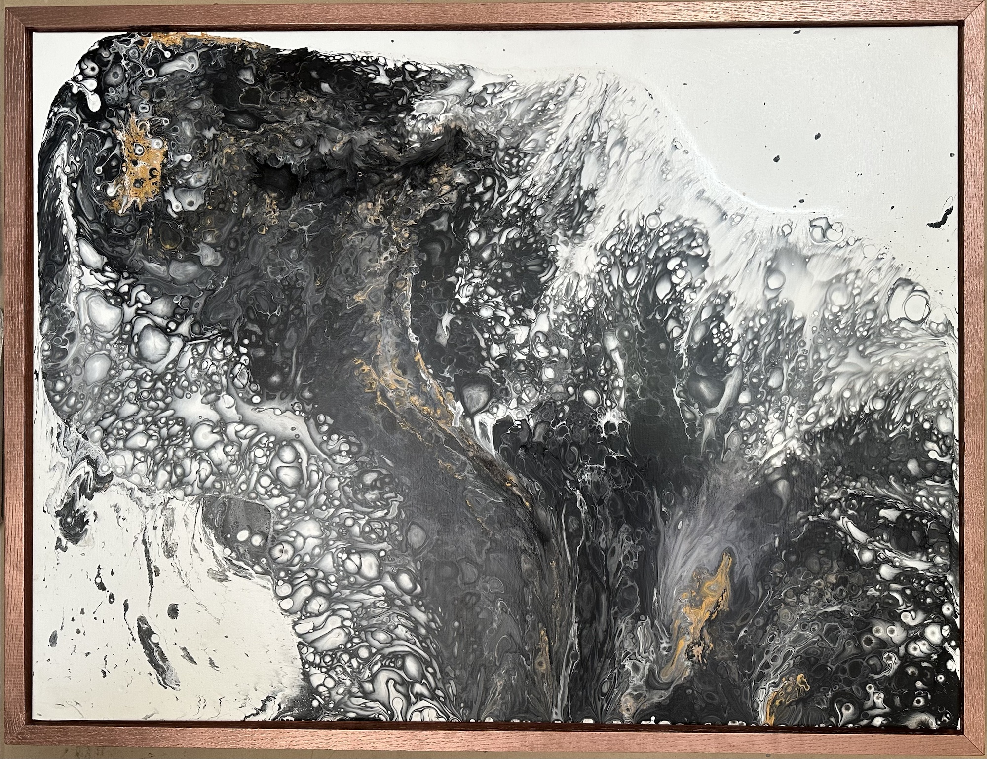 La toile, dominée par des tonalités de noir, de gris et de blanc, est parsemée de détails dorés, créant un contraste élégant qui capture l’attention. L’impression de mouvement est renforcée par les formes tourbillonnantes et les bulles qui rappellent les échos d’un cri puissant. La profondeur des couleurs et les textures invitent à une introspection sur les thèmes universels de l’angoisse et de l’expression humaine.