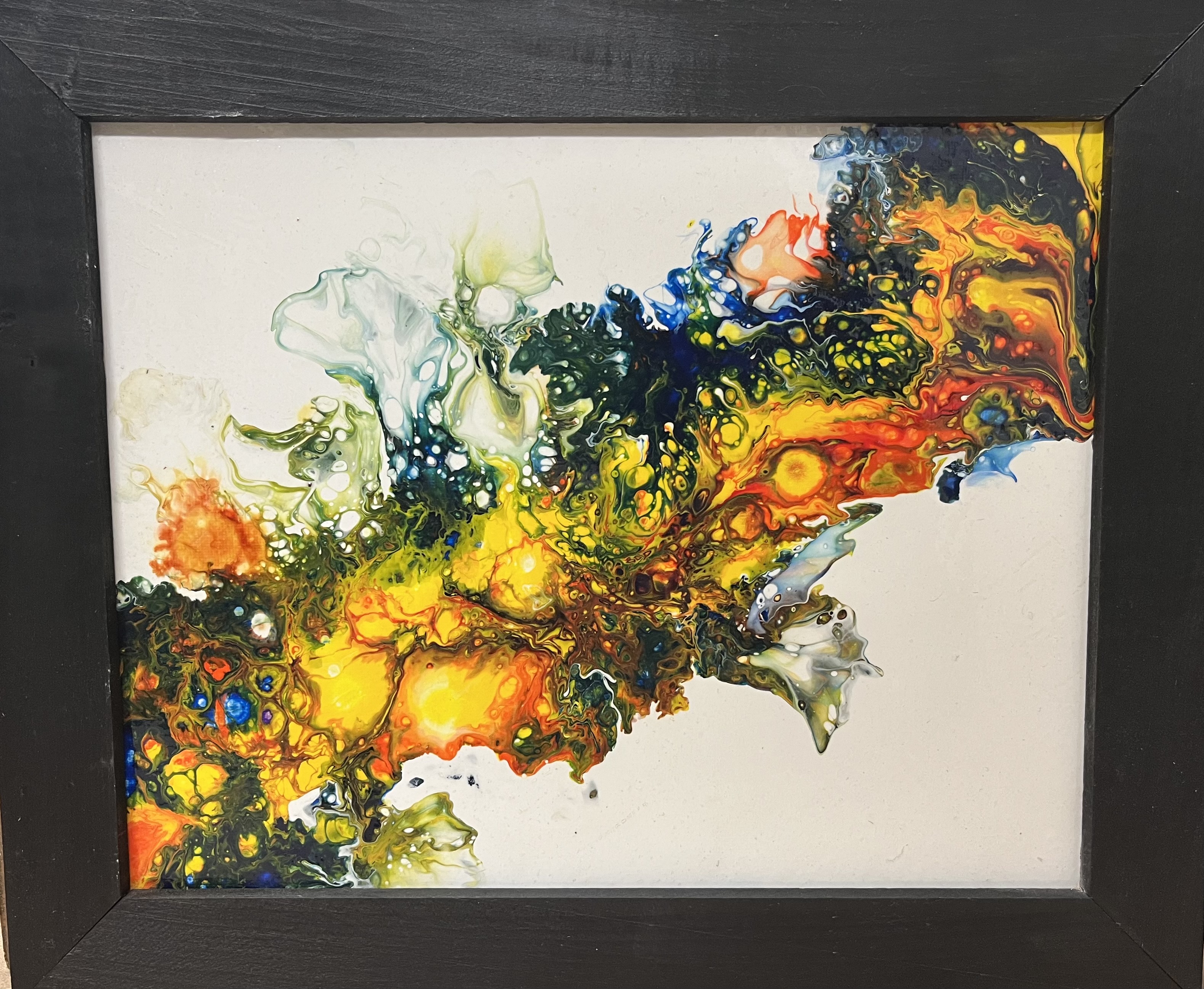 Encadré de noir pour accentuer son impact, ce tableau est un concentré de vie et d’énergie, une fenêtre ouverte sur un monde où la couleur est reine et où l’imagination peut s’épanouir sans limites. « Harmonie Chromatique » est une invitation à se perdre dans le détail de chaque tache, chaque coulée et chaque nuance, pour y découvrir sa propre vision du monde.