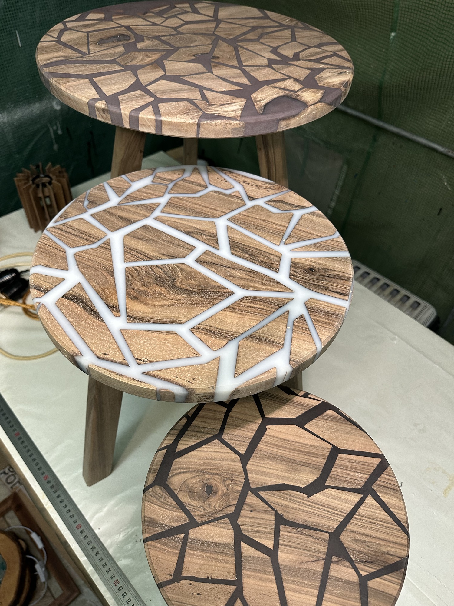 Laissez-vous séduire par notre ensemble « Trio Arachnéen », une collection de trois tables basses qui incarnent la beauté et l’ingéniosité naturelle. Fabriquées avec soin en noyer européen, ces pièces arborent un design unique de résine époxy en teintes contrastées – blanche éclatante, caramel doux et marron profond – qui se marient avec le bois pour créer des motifs hypnotiques.