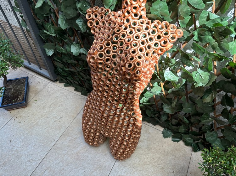 Intitulée « Vénus d’Écrou », cette sculpture contemporaine réinvente la déesse de la beauté à travers une mosaïque de près de 500 écrous métalliques. Chaque écrou, soigneusement positionné, contribue à la forme sensuelle et dynamique du buste, peint dans une palette éblouissante de cuivre et d’or qui capture et réfracte la lumière.